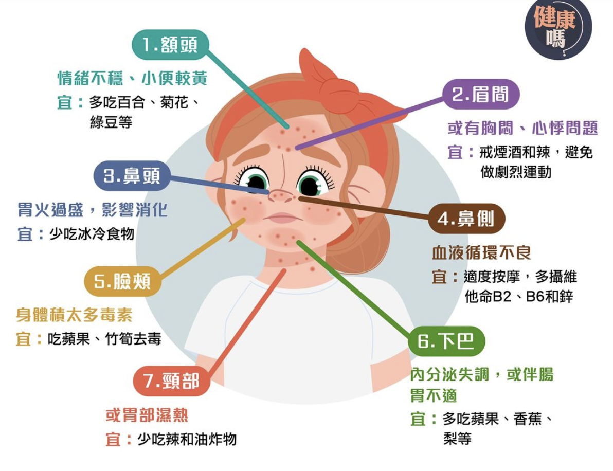 古籍曰:「面皰者,謂面上有風熱氣生皰」,在中醫角度,面部皮膚可以直接反應五臟六腑氣血虛盛與外邪干擾的情形,而長暗瘡代表五臟六腑有潛在的「熱」和「火」,它們生長的地方反映了身體哪裡出現毛病,或與作息時間、飲食和生活習慣有關。