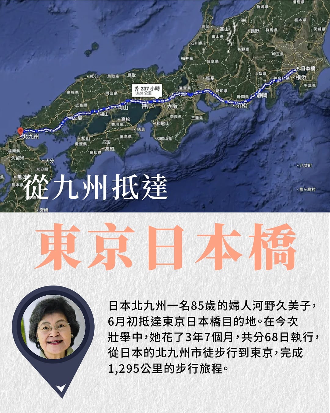 你體驗過走路的快樂嗎?當大多數人選擇新幹線穿梭日本各地時,85歲的河野久美子選擇了一條截然不同的路——用雙腳丈量從九州到東京的1,295公里距離。這趟耗時3年7個月的徒步旅程,不僅重新定義了高齡健康的可能性,更為計劃日本旅行的旅客提供了全新的視角。