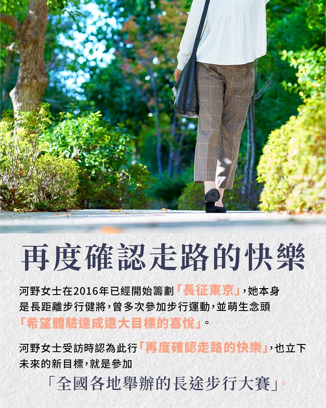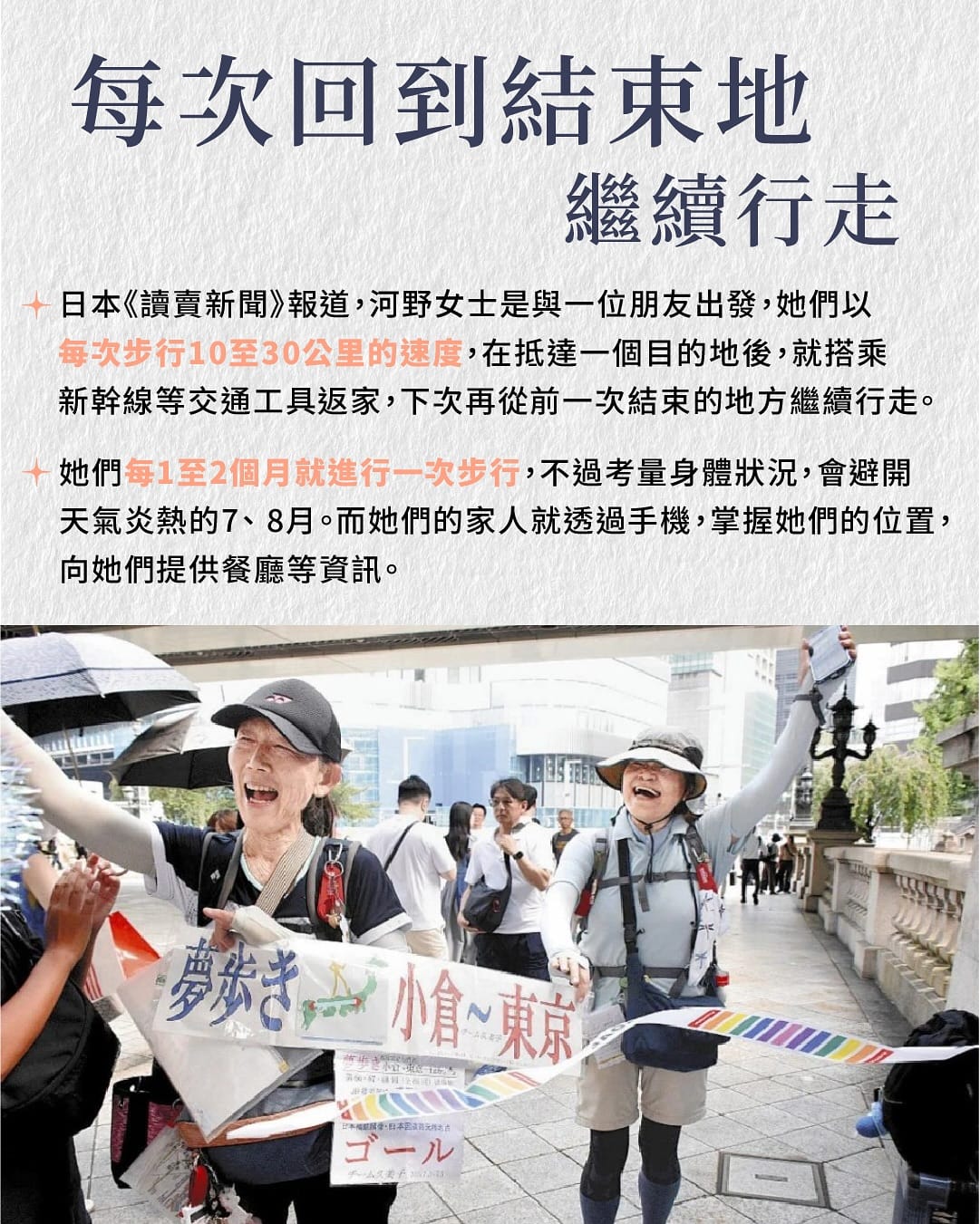 河野女士在接受訪問時表示,這趟旅程讓她「再度確認走路的快樂」。對於習慣快速移動的現代人來說,這句話值得深思。