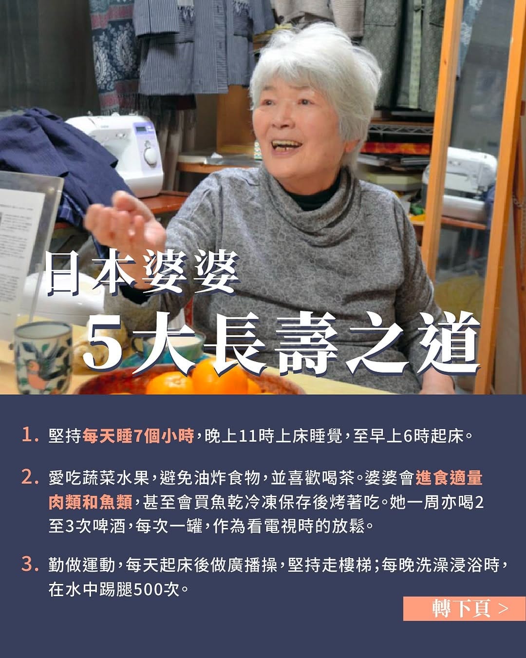 愛吃蔬菜水果,避免油炸食物,並喜歡喝茶。婆婆會進食適量肉類和魚類,甚至會買魚乾冷凍保存後烤著吃。她一周亦喝2至3次啤酒,每次一罐,作為看電視時的放鬆。