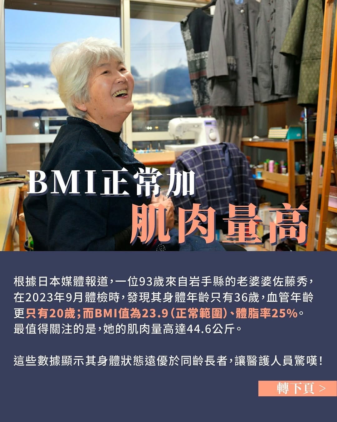 根據日本媒體報道,一位93歲來自岩手縣的老婆婆佐藤秀,在2023年9月體檢時,發現其身體年齡只有36歲,血管年齡更只有20歲;而BMI值為23.9(正常範圍)、體脂率25%。最值得關注的是,她的肌肉量高達44.6公斤。