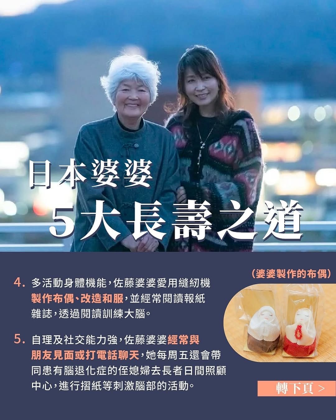 佐藤婆婆經常與朋友見面或打電話聊天,她每周五還會帶同患有腦退化症的伴娘婦去長者日間照顧中心,進行摺紙等刺激腦部的活動。