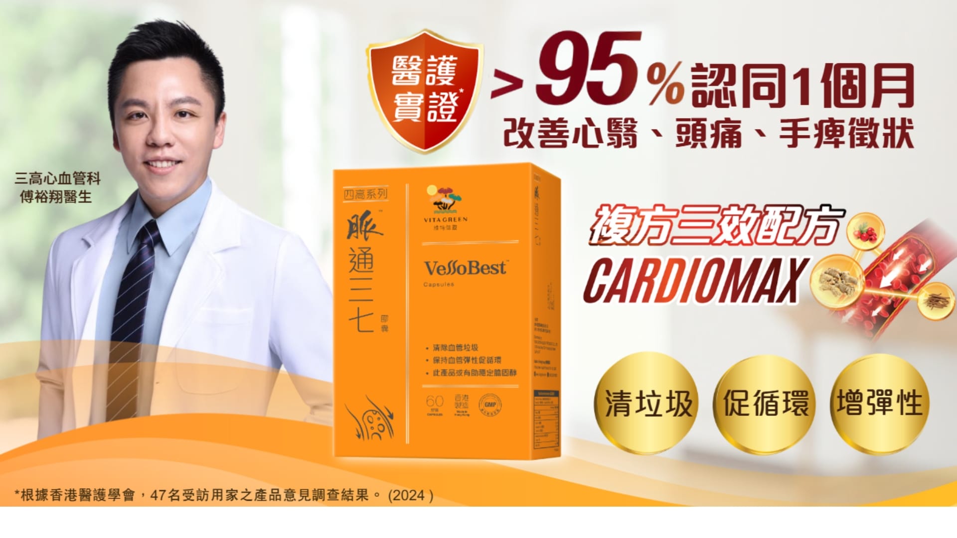 傅裕翔醫生指出,單靠飲食控制無法全面保護心血管,穩住三高指數,加上年齡增長,身體更難清走日積月累的肥油垃圾。所以想要改善心血管健康,除了注意飲食外,亦可配合保持心血管健康的保健食療,科研顯示中草本三七的活性成分三七皂苷,再加上丹參中的丹參酮,相比只用三七,清血管肥油的效能高3倍^,更有效強心臟、暢通心血管。