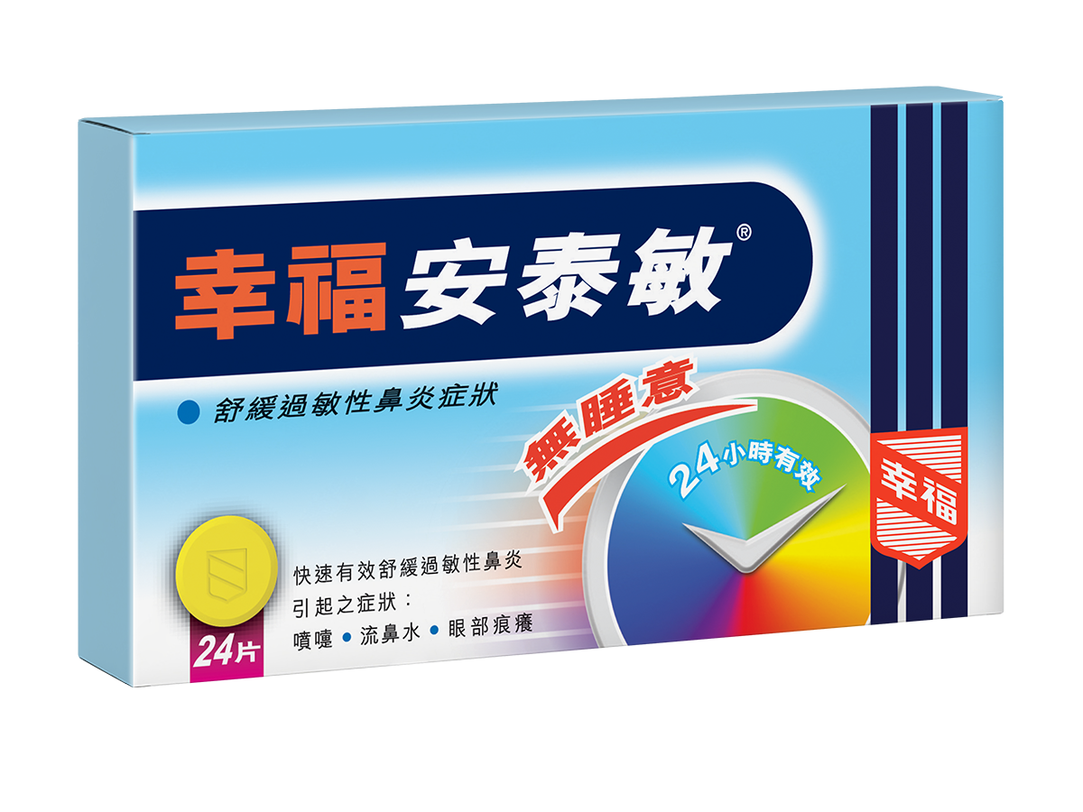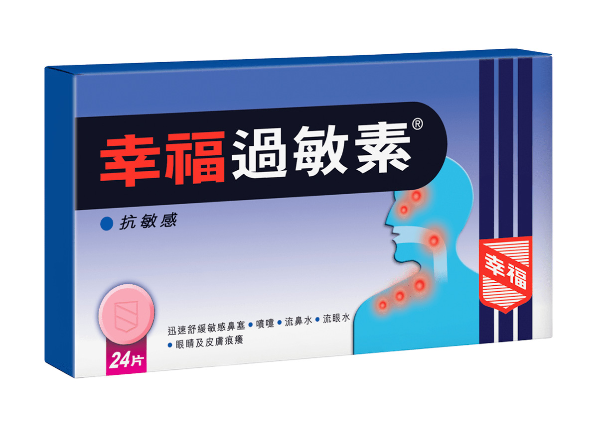 幸福過敏素能迅速紓緩因花粉症及鼻炎所引起的上呼吸道過敏,以及皮膚敏感症狀。其成分為 Chlorpheniramine Maleate,與醫生經常處方的「黃丸仔」成分一樣,因安全性高而在臨床上廣泛使用。幸福過敏素會產生睡意,對於因敏感而難以入眠、或希望夜晚能好好休息的人士特別合適。透過一覺好眠,翌日更能精神充沛地應對生活。