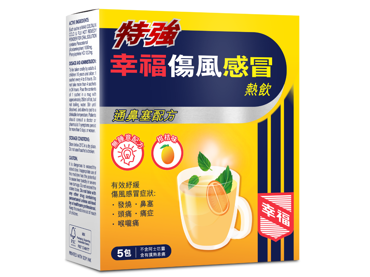 若確認不適並非源自過敏,而是普通感冒,就可試試幸福醫藥新推出的柑桔味「特強幸福傷風感冒熱飲」。此產品為無睡意配方,能迅速紓緩因感冒引起的鼻塞、喉嚨痛與頭痛不適。其中特別添加多20%通鼻成份*,能有效針對鼻塞問題。