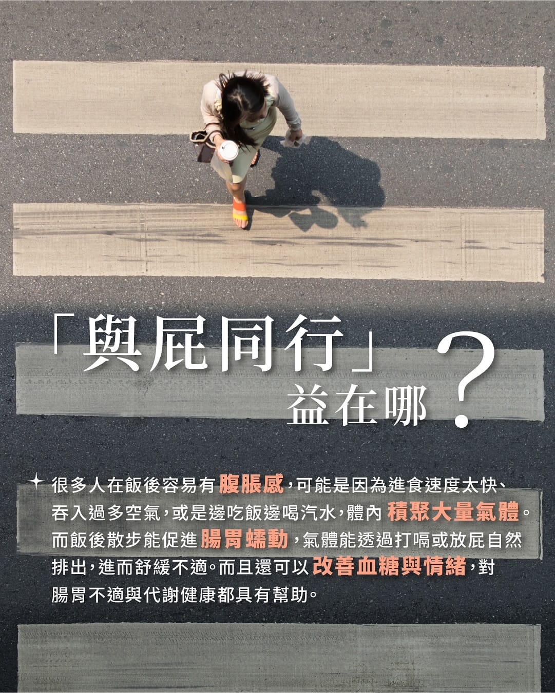 除了幫助排氣,飯後散步還可以改善血糖與情緒,對腸胃不適與代謝健康都具有幫助。這讓「放屁散步」不僅是解決腹脹問題的方法,更是一個綜合性的健康習慣。