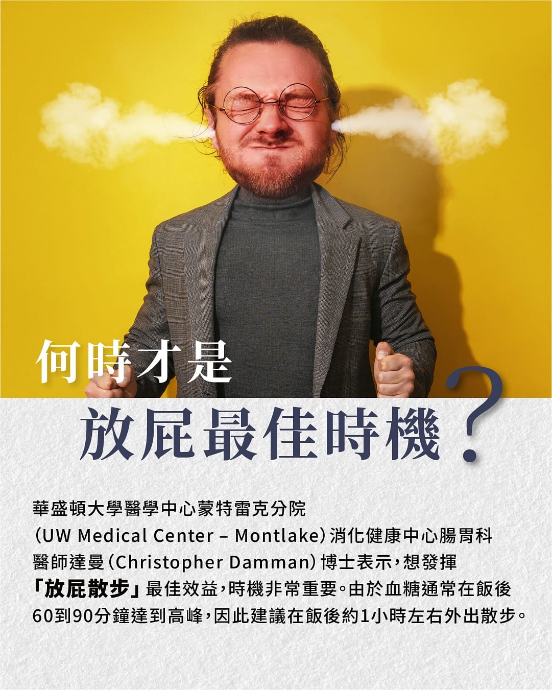 華盛頓大學醫學中心蒙特雷克分院消化健康中心腸胃科醫師達曼(Christopher Damman)博士表示,想發揮「放屁散步」最佳效益,時機非常重要。由於血糖通常在飯後60到90分鐘達到高峰,因此建議在飯後約1小時左右外出散步。