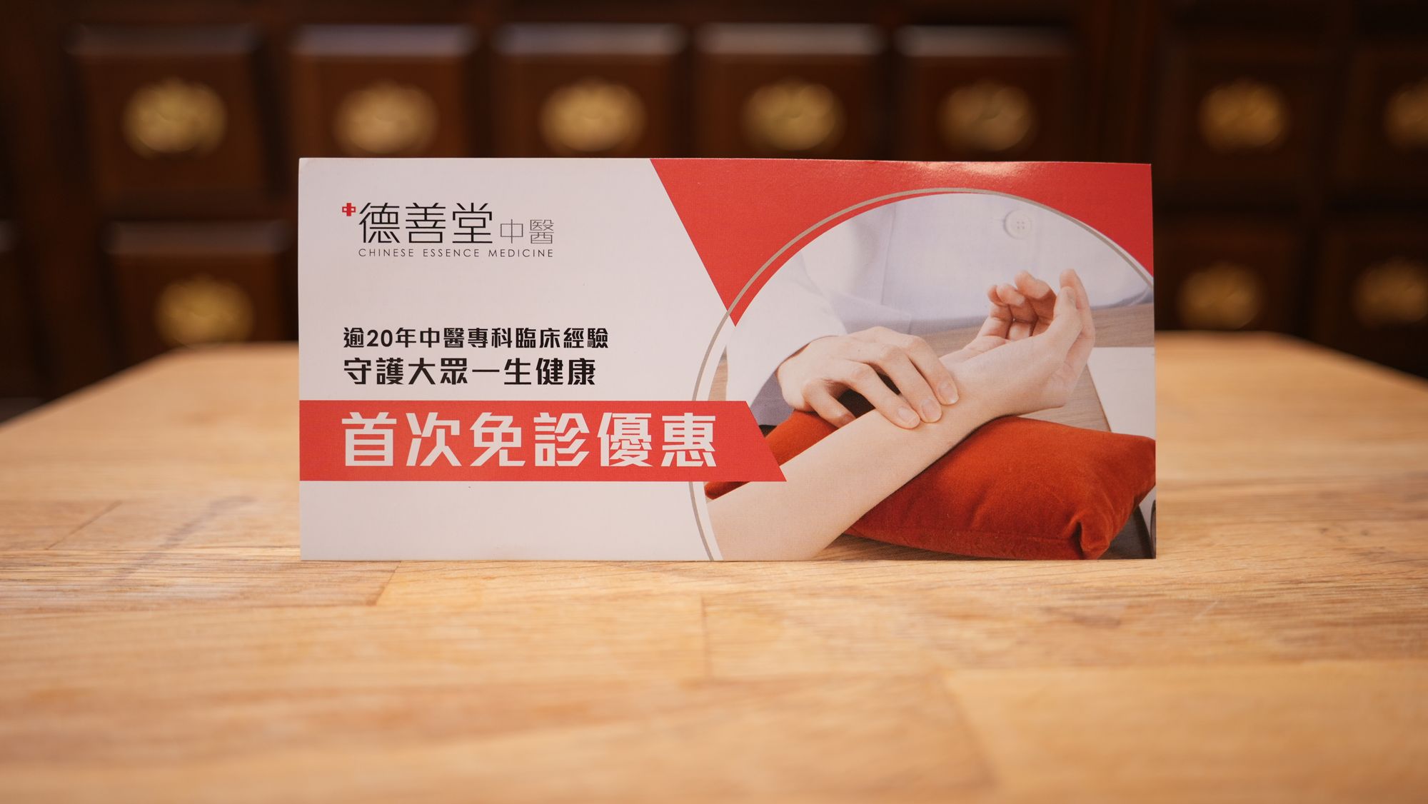 您將獲得一張德善中醫堂的免費診療券(免診金,藥費自付)