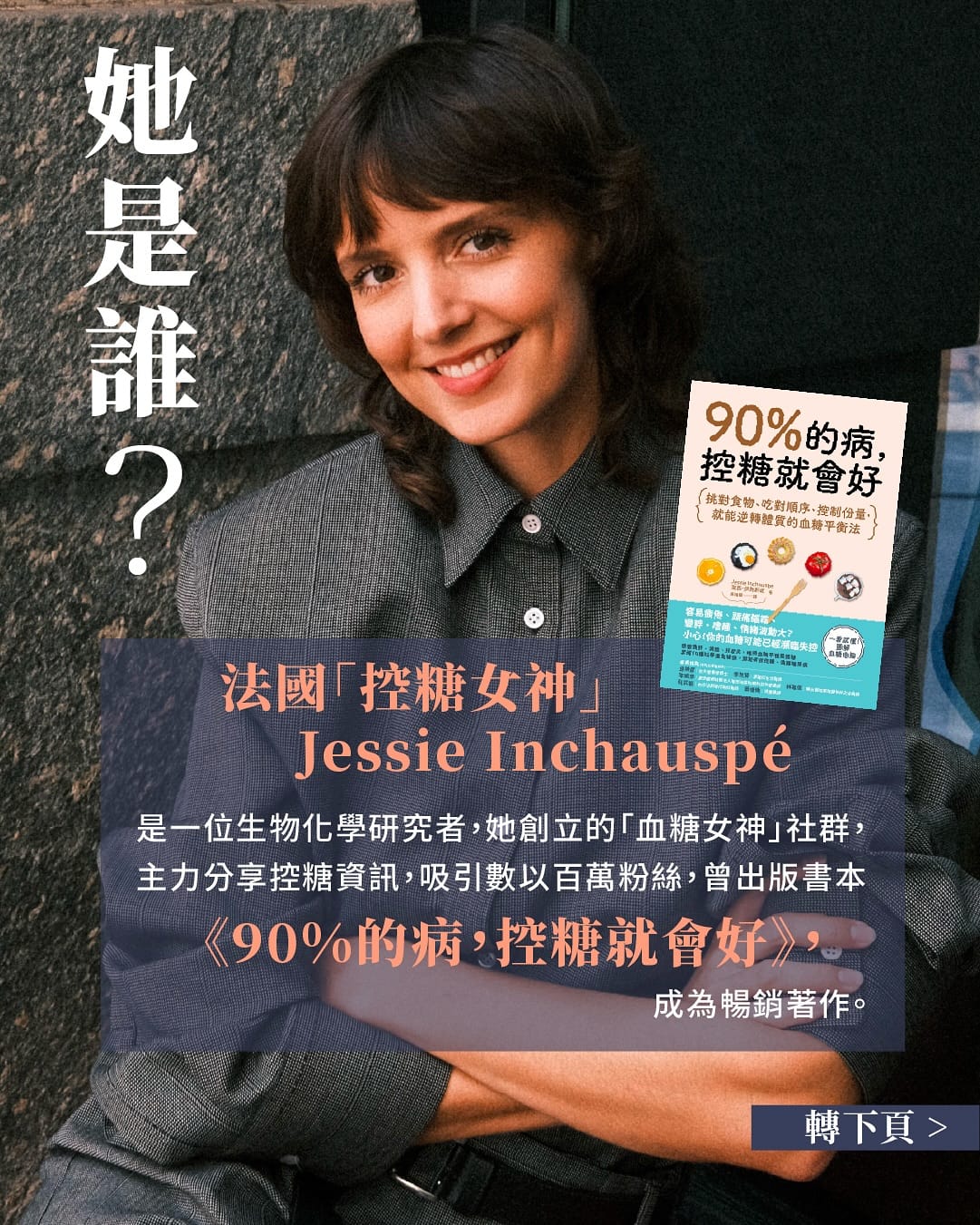 Jessie Inchauspé 是一位生物化學研究者,她創立的「血糖女神」社群主力分享控糖資訊,吸引數以百萬粉絲。她曾出版書本《90%的病,控糖就會好》,成為暢銷著作。