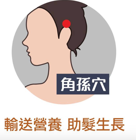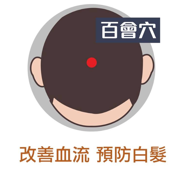 功效:屬督脈。中醫認為此為全身之氣匯流處,為萬能穴位。按壓百會穴能調整自律神經、緩和緊張,並促進血液流動,改善氣血循環,維持頭髮正常營養供給。可預防各種原因導致的白髮,並有提神醒腦和加快生髮的作用。