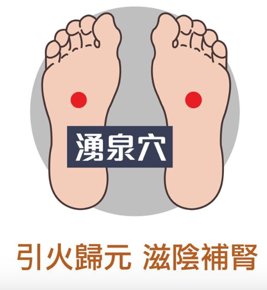 功效:為腎經起點,有引火歸元,滋陰補腎的功效。按壓刺激此處能幫助從腳尖一直到全身的血液流動,有保養腎的效果,能幫助改善手腳冰冷。