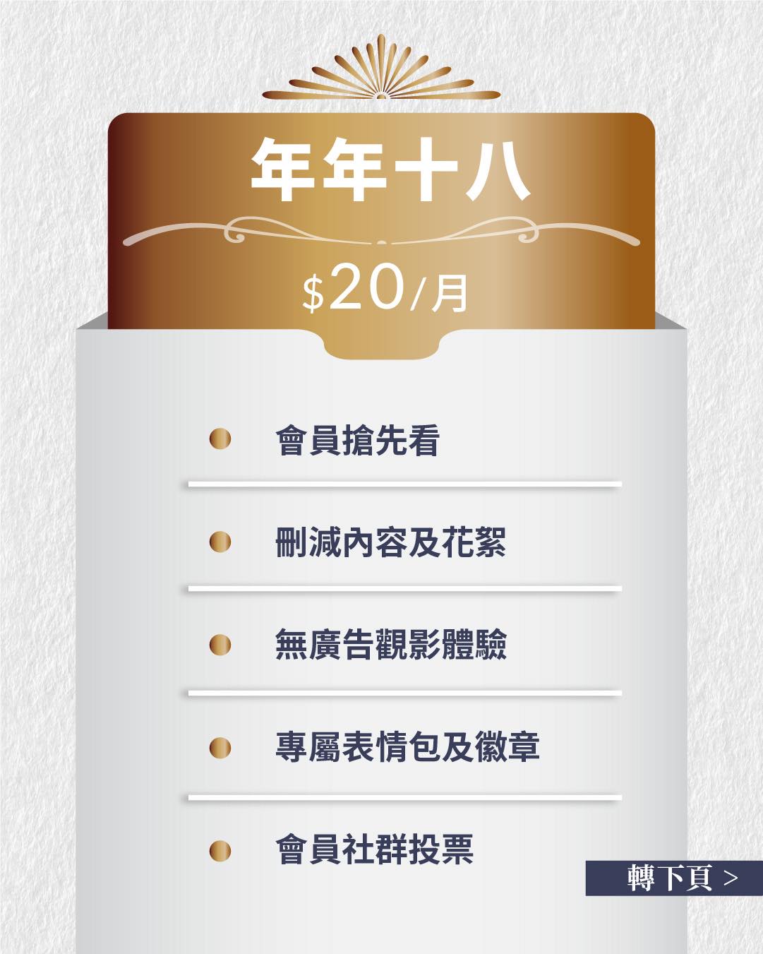 溫馨提示:現時 「純支持」($15/月)會員將於1月1日起,由YouTube系統自動提升至「年年十八」($20/月)等級,敬請注意!