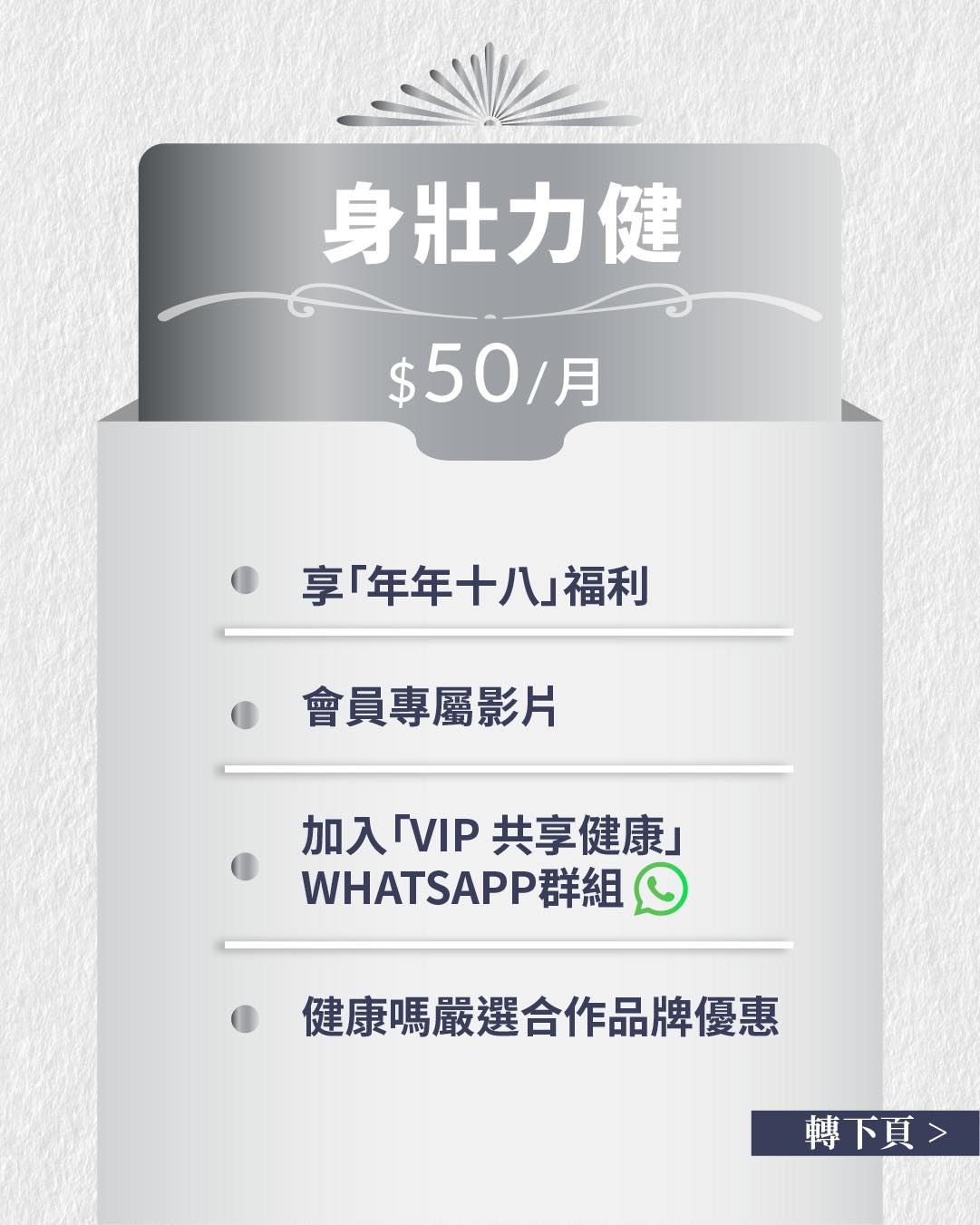 LV.3 福壽雙全-$80/月不但為您帶來更多、更深、更廣健康資訊,更可解鎖連串會員福利與優惠禮品,並有機會優先參與線下健康活動及一對一與名醫對話,讓健康掌握在自己手中!