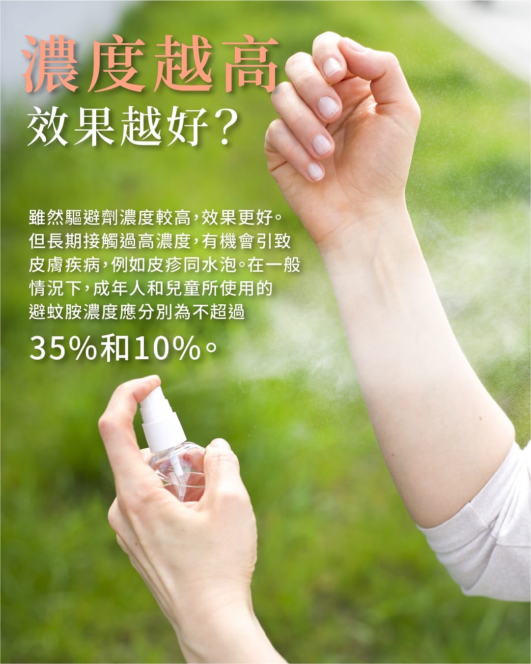 在驅蚊產品的選擇上,濃度是一個關鍵因素。雖然驅蚊劑濃度較高時,效果確實更好,但這並不意味著濃度越高越適合所有人使用。
