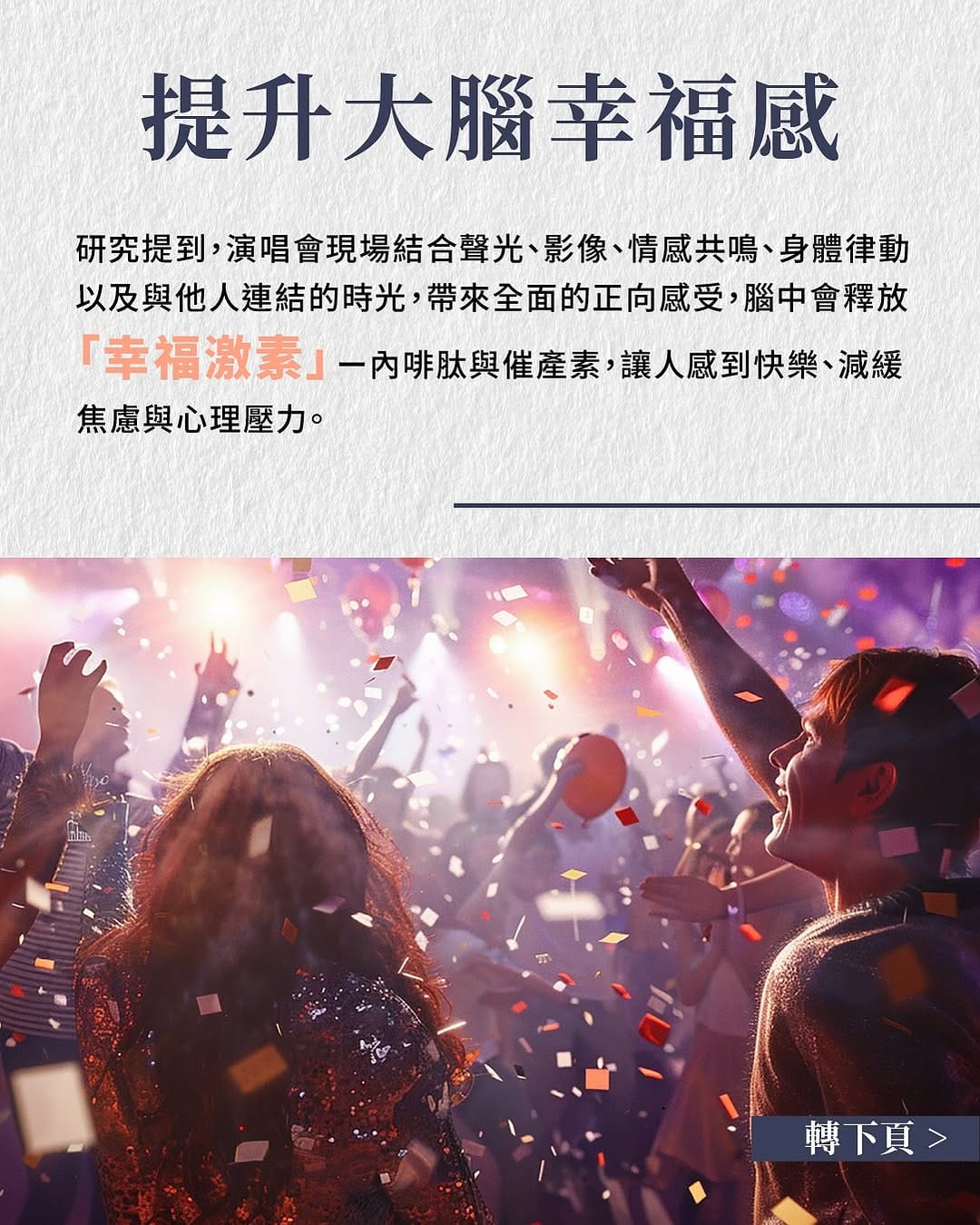 研究指出,演唱會現場獨特的環境——結合聲光效果、影像刺激、情感共鳴、身體律動,以及與他人的連結時光——能為觀眾帶來全面的正向感受。在這個過程中,大腦會釋放「幸福激素」,包括內啡肽與催產素,讓人感到快樂、減緩焦慮與心理壓力。