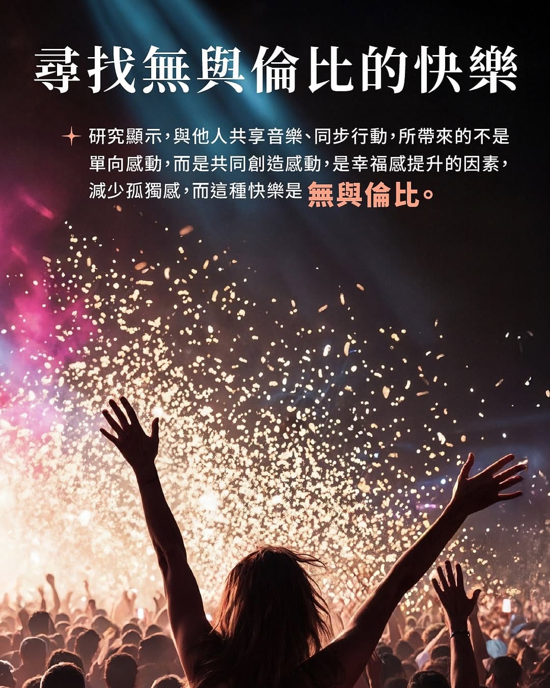 「與他人共享音樂、同步行動,所帶來的不是單向感動,而是共同創造感動,是幸福感提升的因素,減少孤獨感,而這種快樂是無與倫比。」研究報告如此描述現場音樂體驗的獨特性。