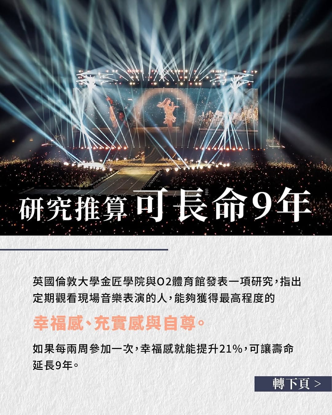 英國倫敦大學金匠學院與O2體育館聯合發表的一項研究顯示,定期觀看現場音樂表演的人,能夠獲得最高程度的幸福感、充實感與自尊提升。更令人驚訝的是,如果每兩週參加一次現場演出,幸福感可提升21%,甚至有助於延長壽命9年。