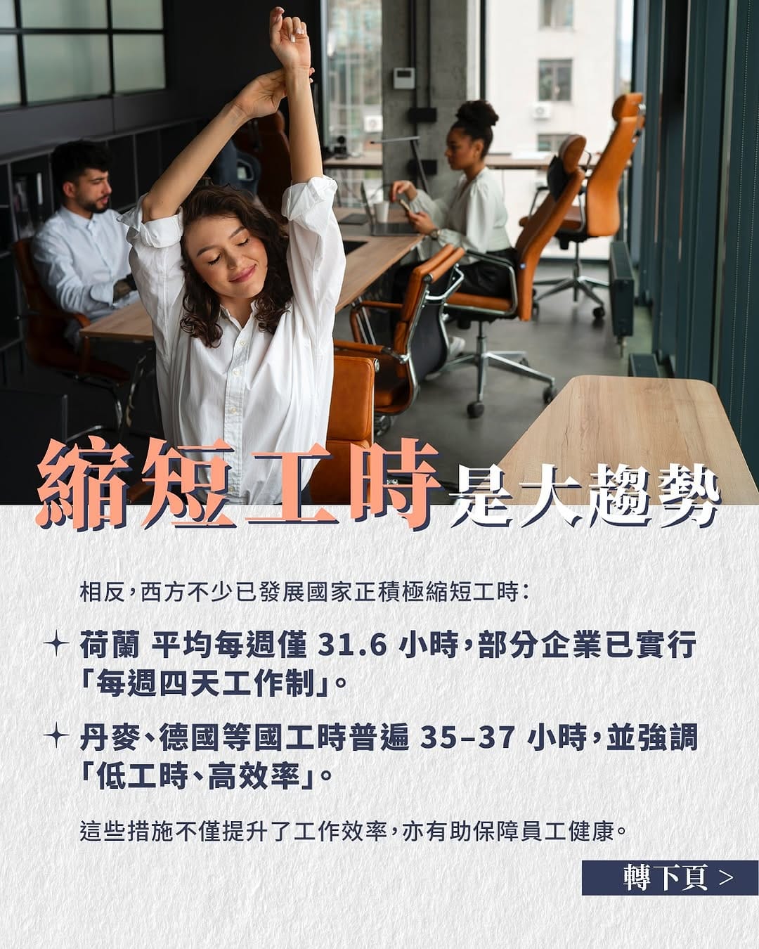 相較於香港的過勞現象,西方已發展國家正朝著相反方向發展。荷蘭作為工時改革的先驅,平均每週工作時間僅31.6小時,部分企業更已實施「每週四天工作制」。丹麥、德國等歐洲國家的工時普遍控制在35至37小時之間,並強調「低工時、高效率」的工作模式。