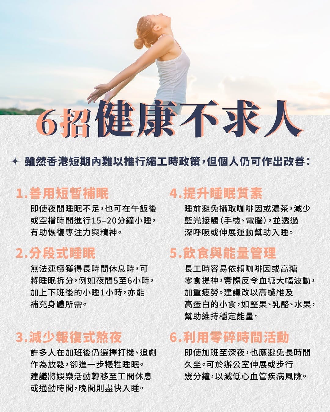 雖然香港短期內難以推行全面的縮工時政策,但個人仍可透過以下六項策略改善健康狀況:
