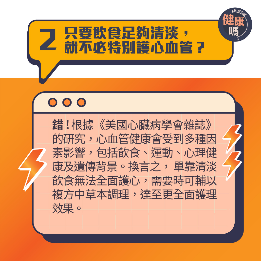 錯!根據《美國心臟病學會雜誌》的研究,心血管健康會受到多種因素影響,包括飲食、運動、心理健康及遺傳背景。換句話說,單靠清淡飲食無法全面保護心血管。想要改善心血管健康,除了注意飲食外,還應結合運動和情緒管理,有需要時可輔以複方中草本調理,才能達至更全面的護理效果。