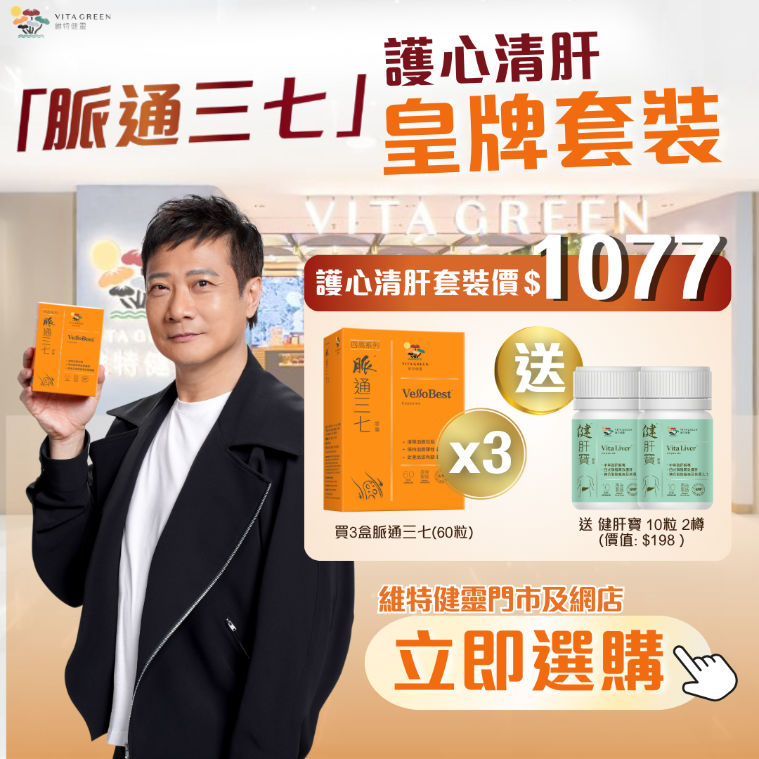 由即日起至7月31日,到維特健靈專門店及網店,買三盒脈通三七(60粒裝)即送 2樽健肝寶 10粒裝 ( 總值: $198 ) ,護心血管又清肝! 快啲到維特健靈門市及網台搶購啦。