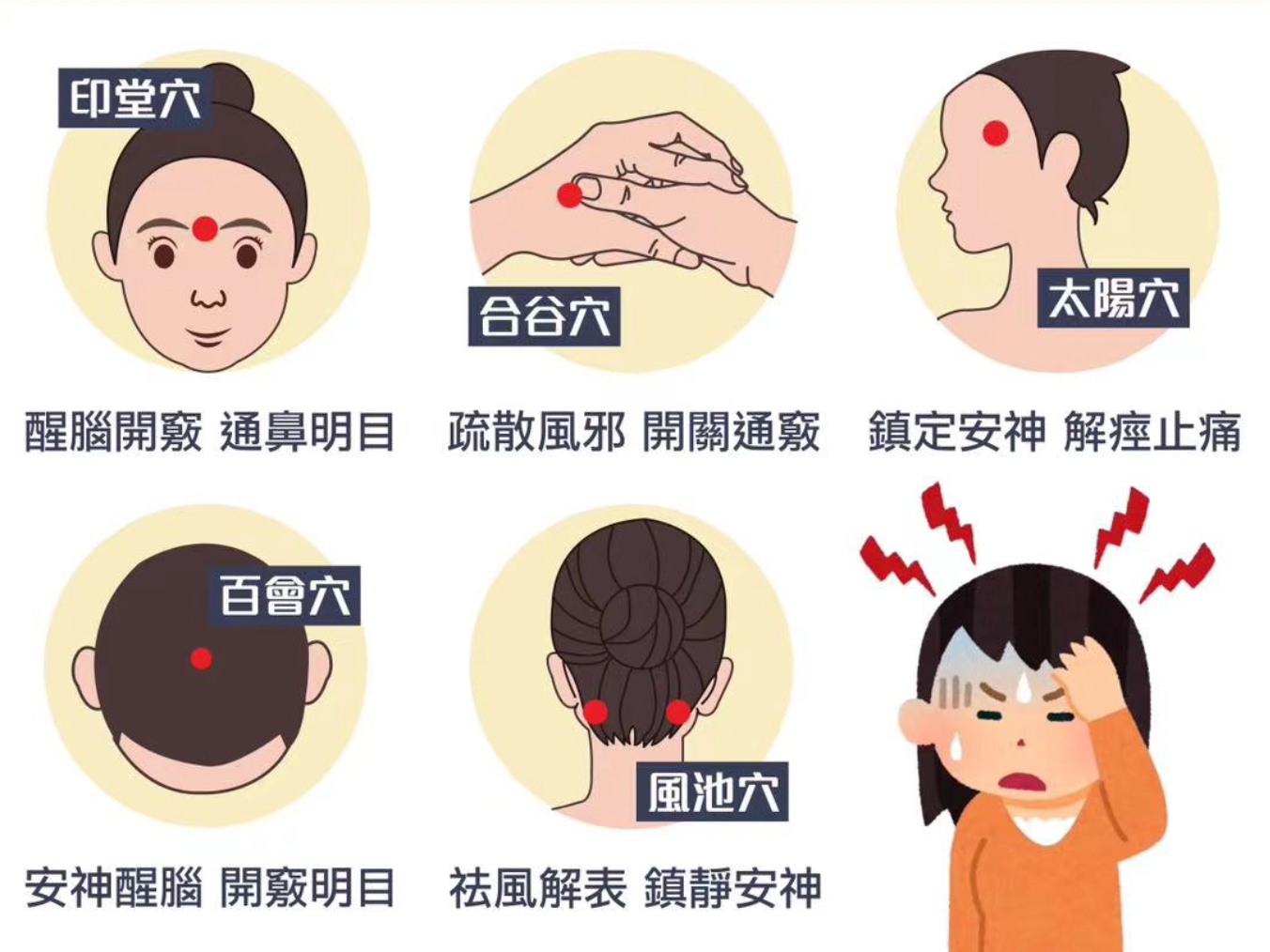 太陽穴:鎮定安神 解痙止痛