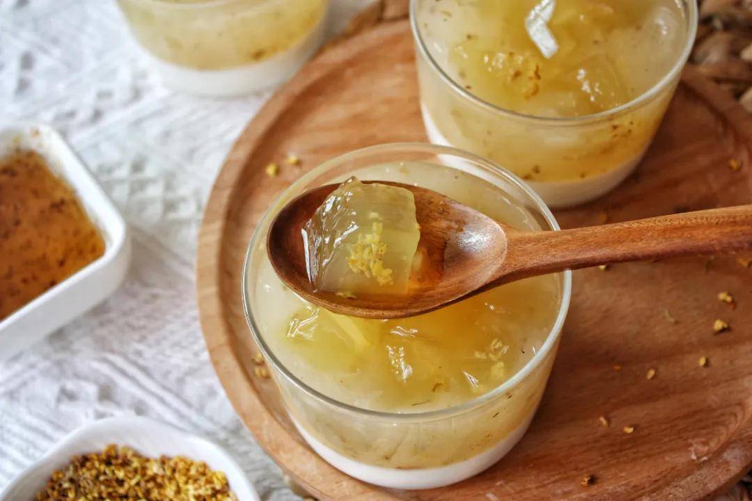 做法:白木耳洗淨泡軟配100cc的水並攪打成細泥狀,搭配剩下500cc的水一起煮滾。慢慢加入寒天粉5g,同時攪拌均勻,小火略滾2分鐘。準備合適容器,將煮滾稍微冷卻後的銀耳桂花凍舀入容器內,放涼再冷藏即可。
