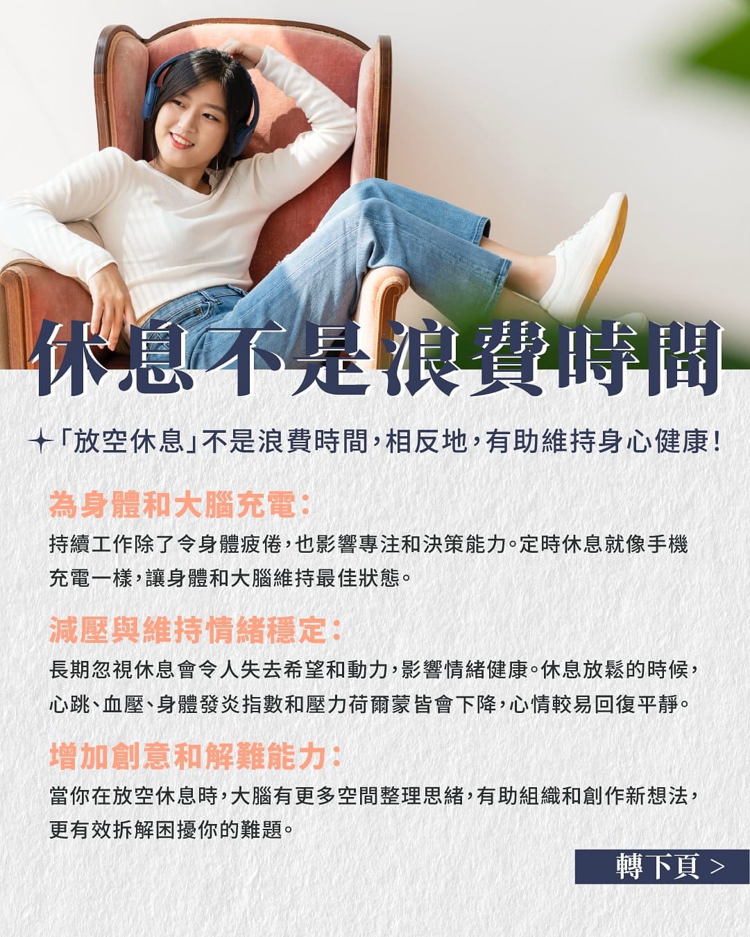 長期忽視休息會令人失去希望和動力,影響情緒健康。休息放鬆的時候,心跳、血壓、身體發炎指數和壓力荷爾蒙都會下降,心情較易回復平靜。