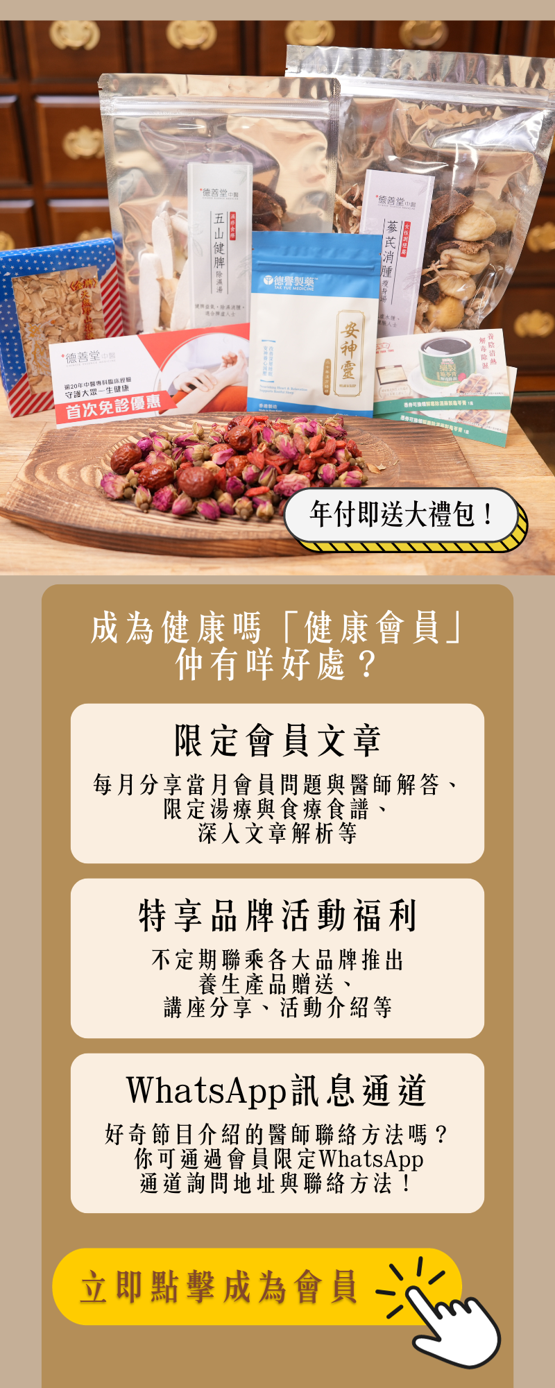 1️⃣ 年付入門厚禮:成為年付會員,即送德善藥業養生排毒寶試用裝 10 粒、德善中醫養心花茶包 10 包、鴻福堂龜苓膏禮券 1 張
