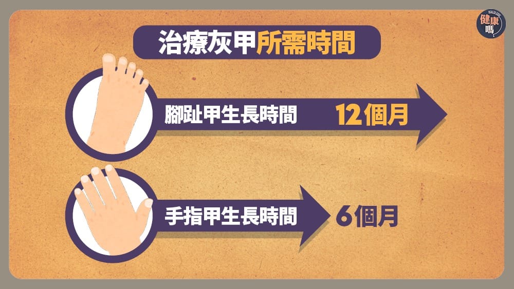 第三,留意用藥所需時間。治療灰甲是一場持久戰,部分患者數星期便自行停藥,實質只能清除表面真菌,未能深入甲床,徹底殺死底層真菌,隨時令灰甲「無限復活」。一般來說,手指甲療程約6至9個月,腳趾甲則需時9至12個月,視乎灰甲感染位置及嚴重程度。