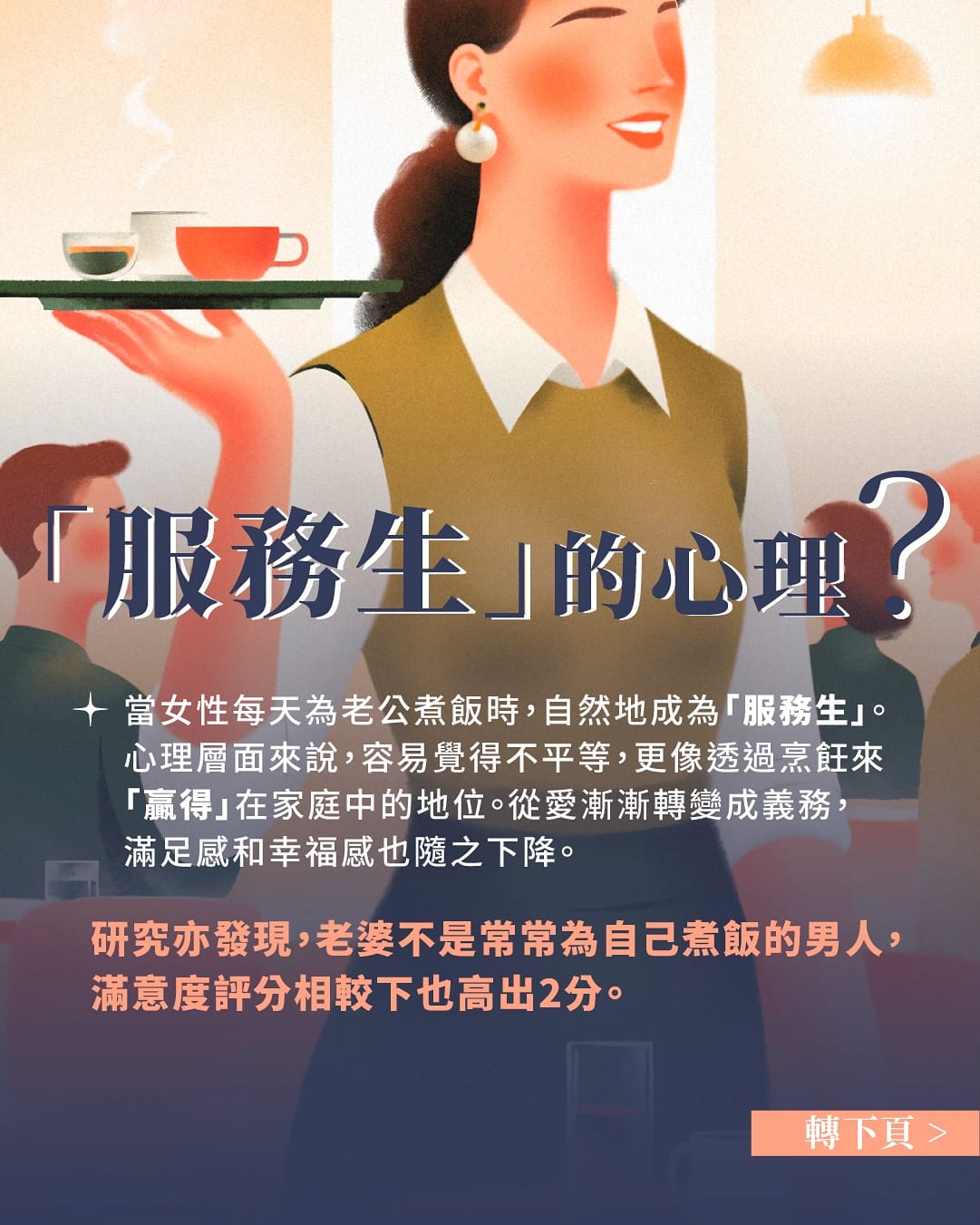 心理層面來說,容易覺得不平等,更像透過煮飯來「贏得」在家庭中的地位。從愛漸漸轉變成義務,滿足感和幸福感也隨之下降。