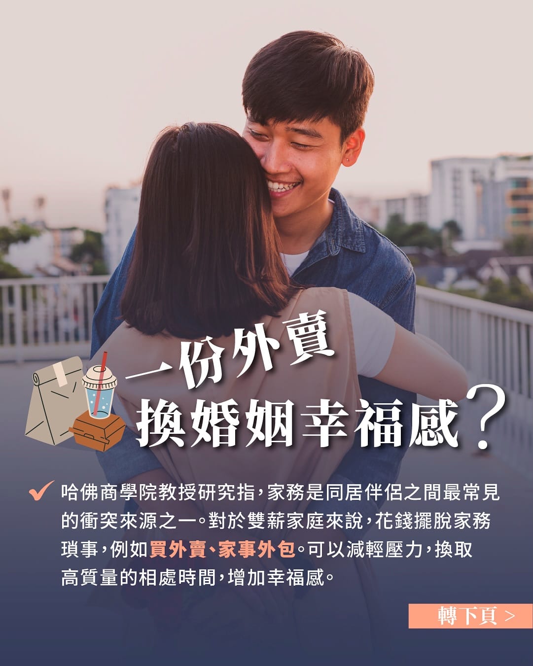 哈佛商學院教授研究指出,家務是同居伴侶之間最常見的衝突來源之一。對於雙薪家庭來說,花錢擺脫家務瑣事,例如買外賣、家事外包,可以減輕壓力,換取高質量的