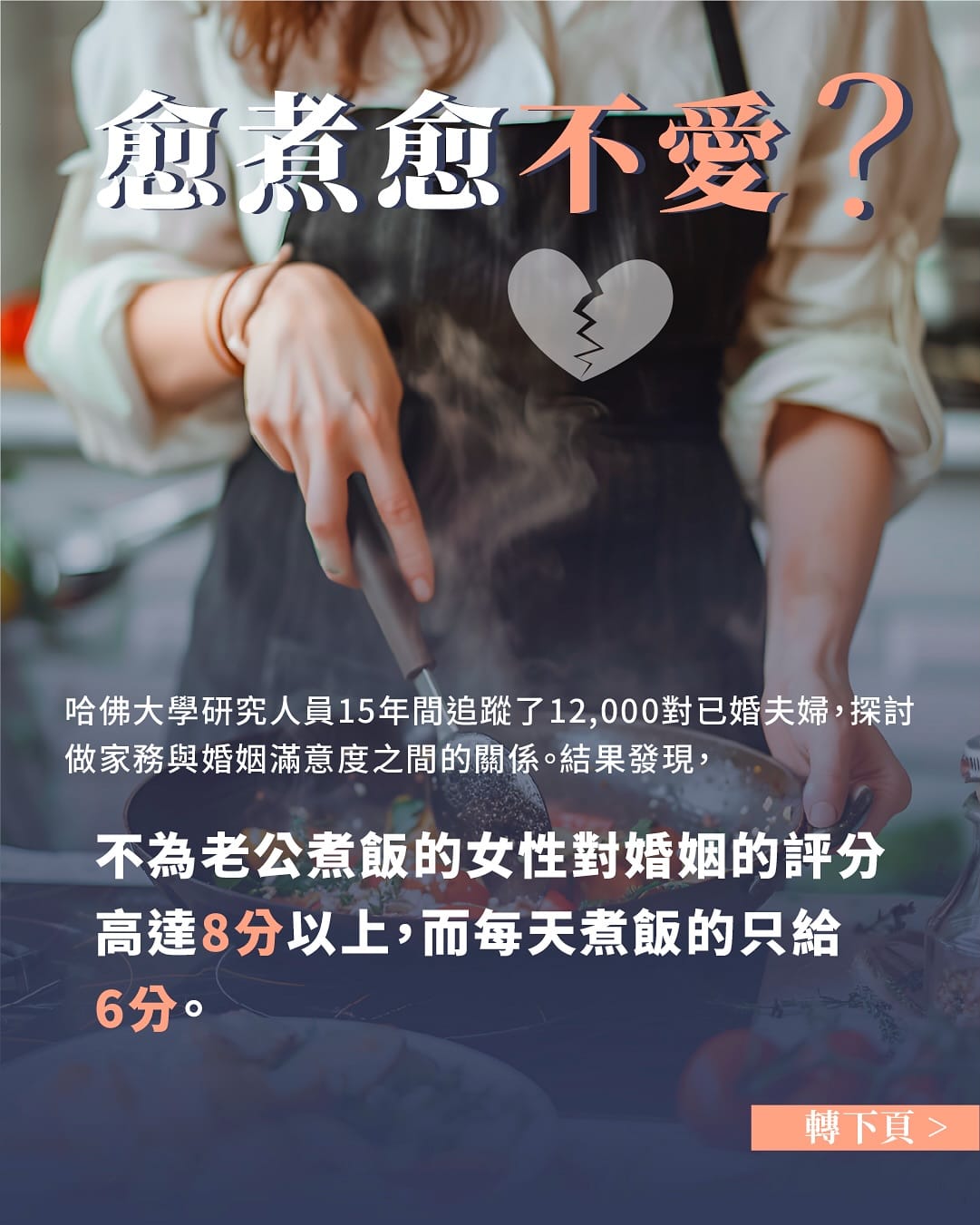 哈佛大學研究人員追蹤了12,000對已婚夫婦,探討做家務與婚姻滿意度之間的關係。研究發現,當女性每天為老公煮飯時,容易產生「服務生」心態。